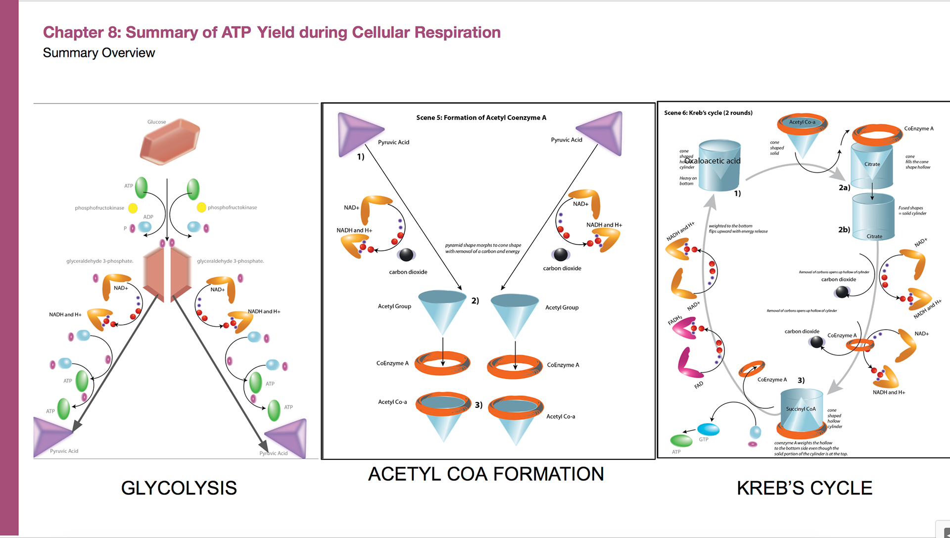 Biochemistry 101: Cellular Respiration. Ten chapters summarizing glycolysis, acetyl acid formation, the Kreb's (citric acid) cycle, electron transport chain, transamination, and beta oxidation. Active transport was used as an example of ATP's role in doing work in the body.